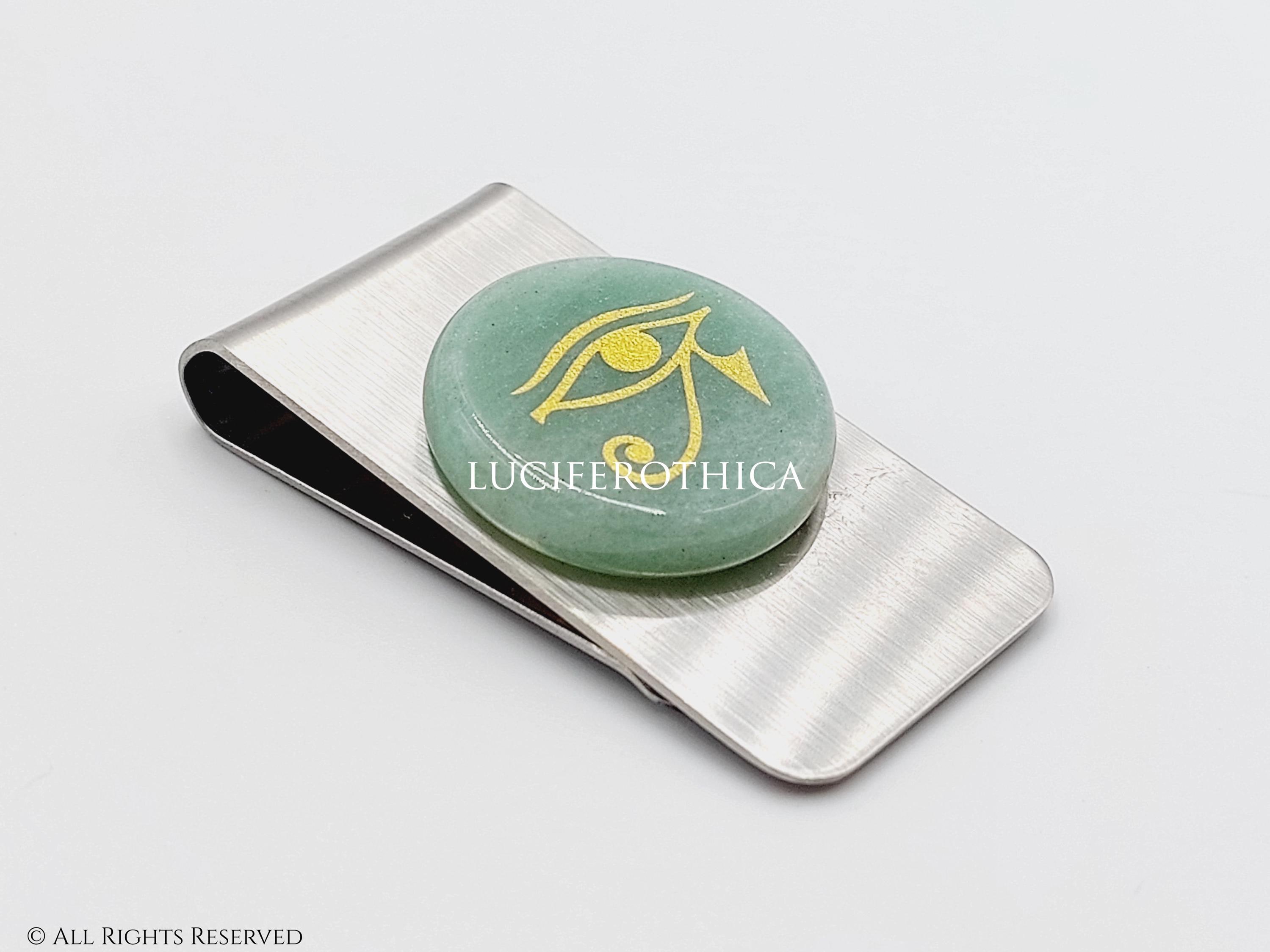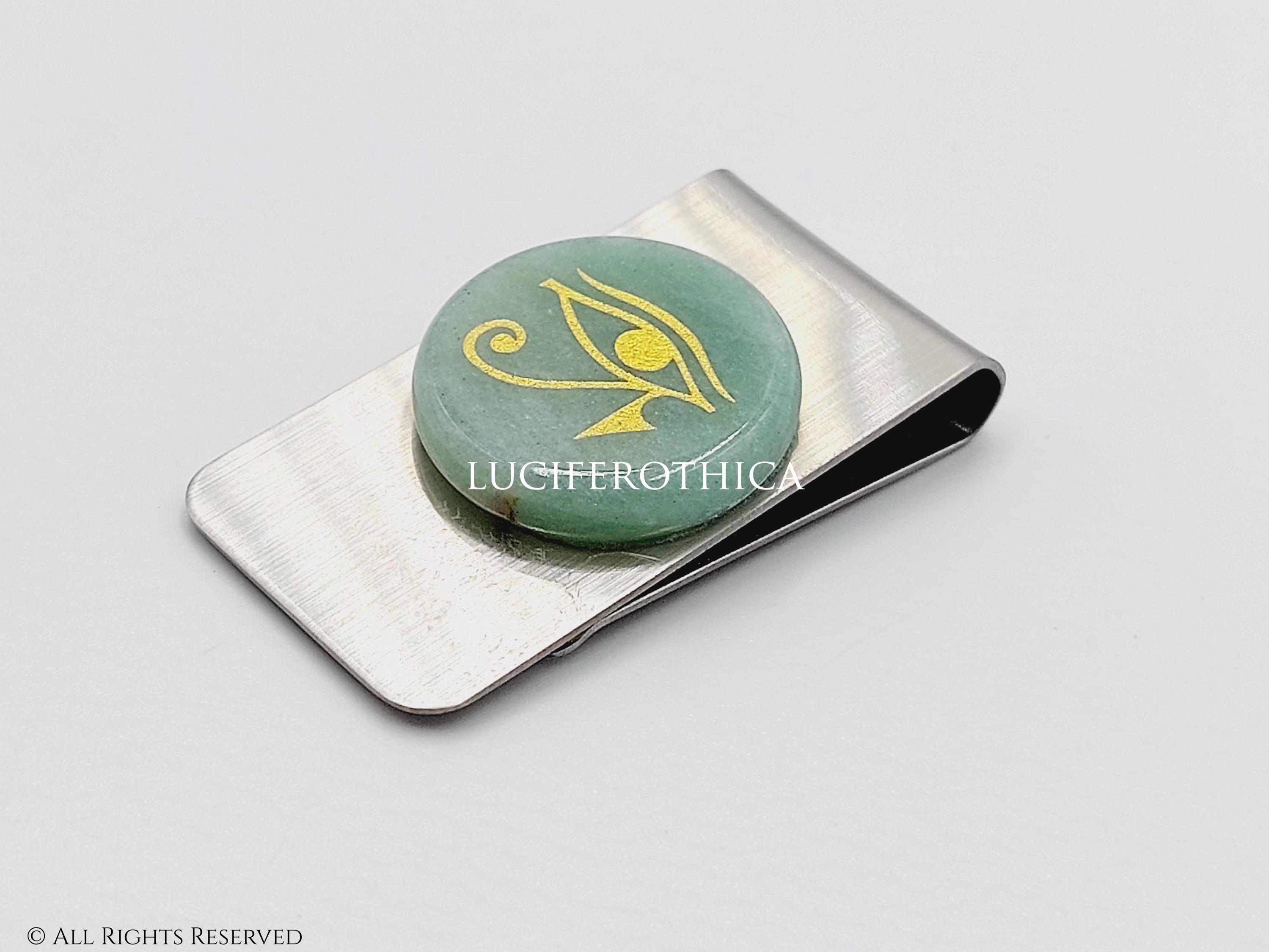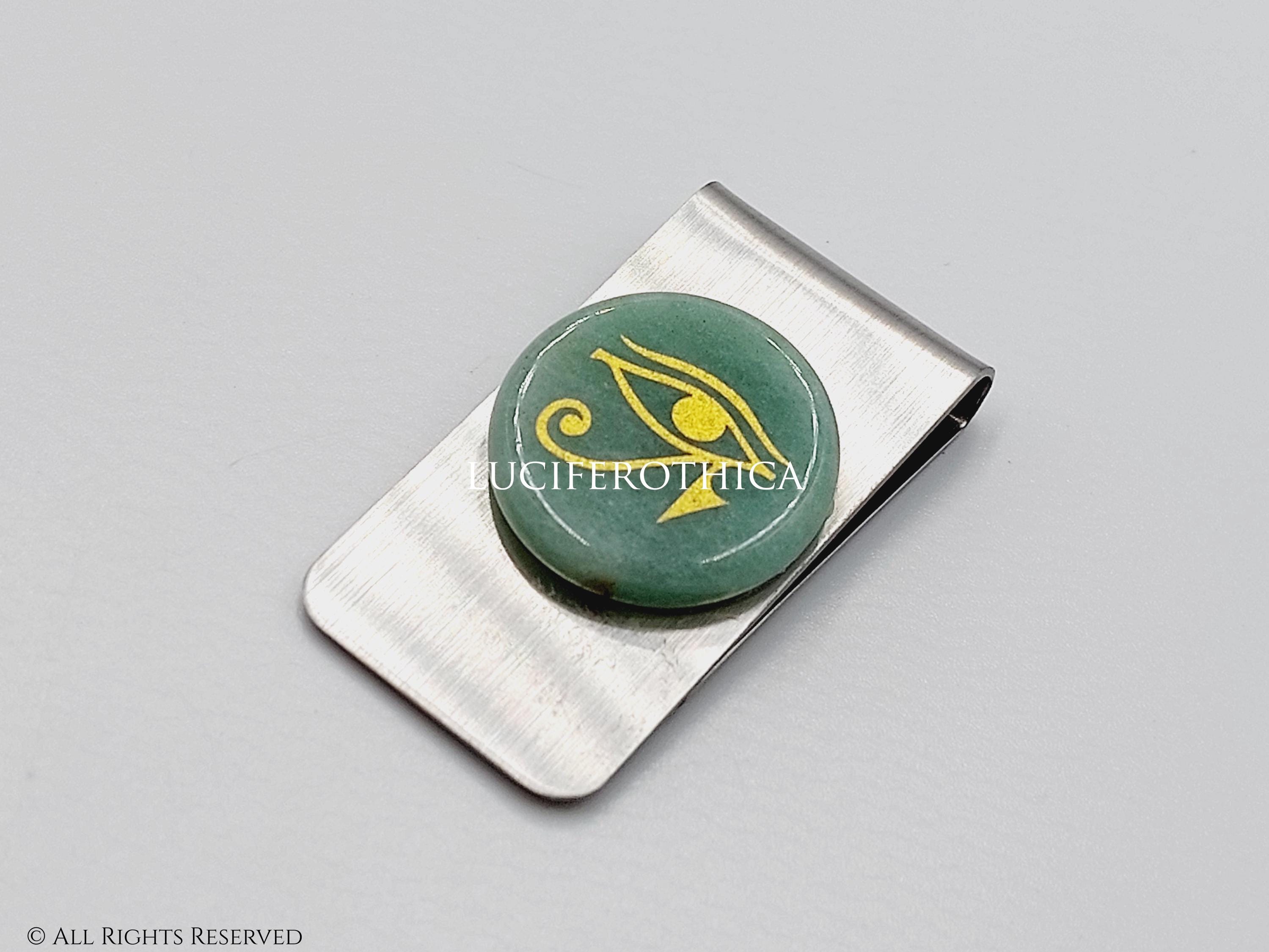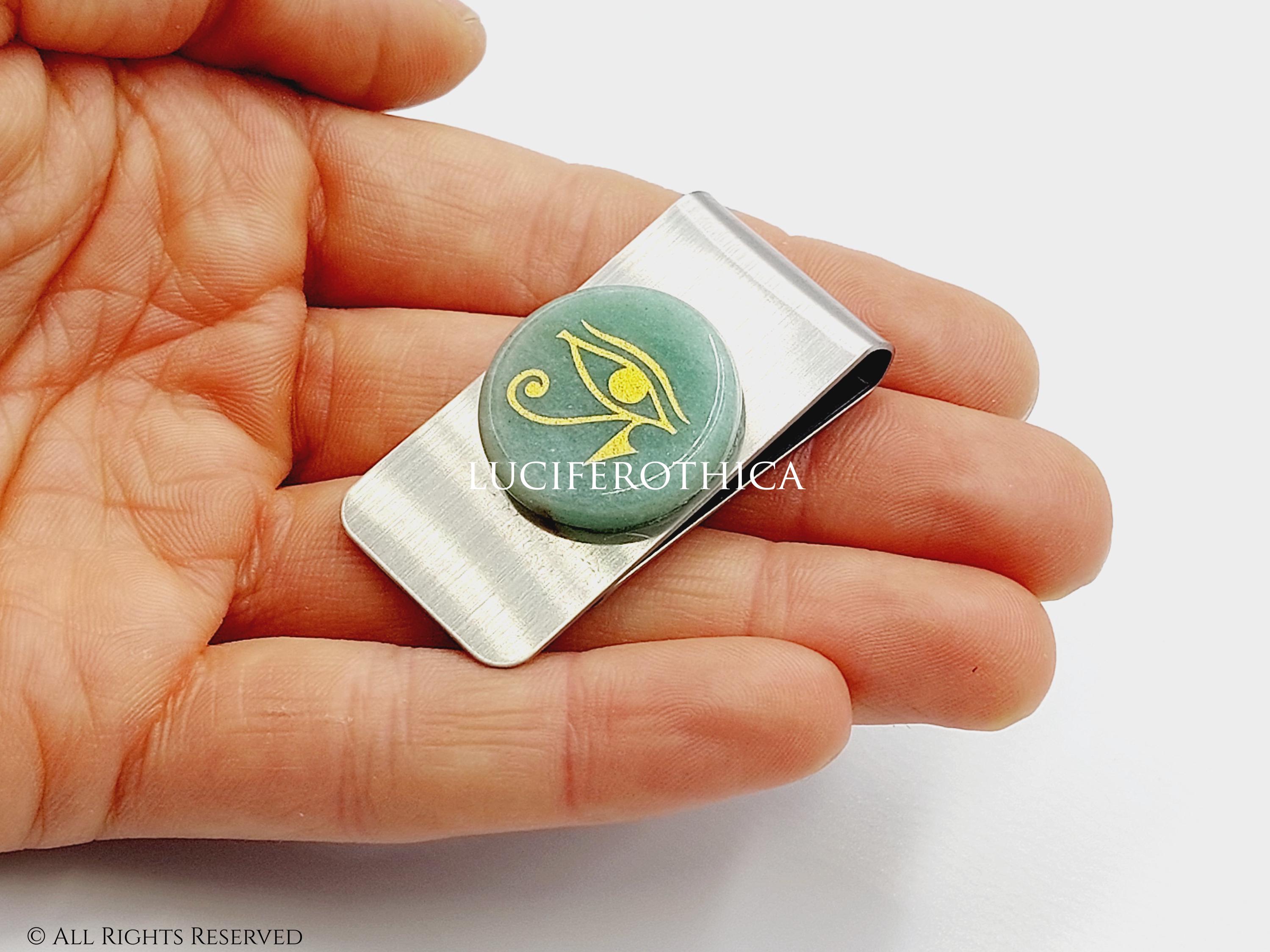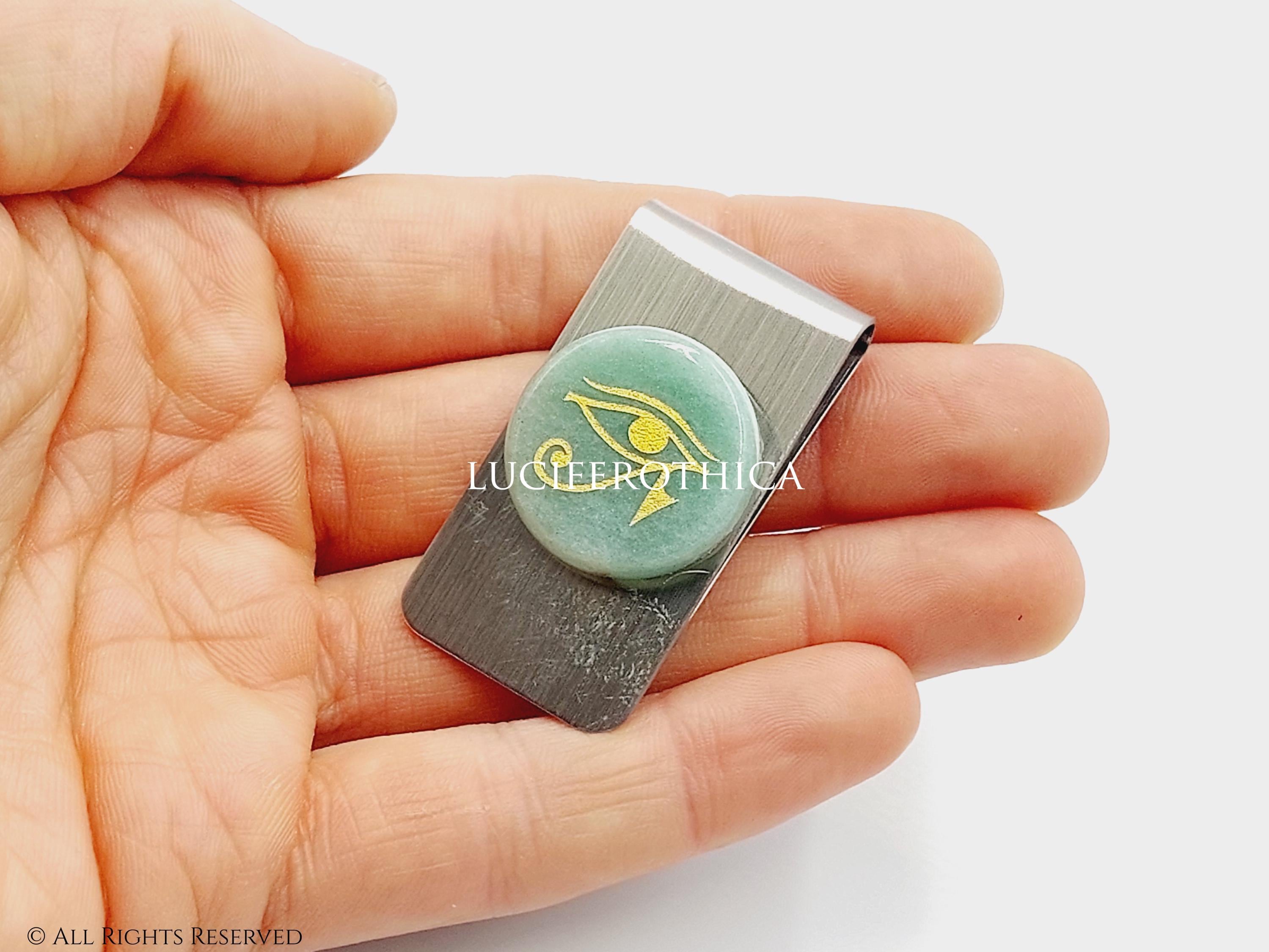 - Round Disk shaped polished green Aventurine Crystal on top with Eye of Horus engraving and gold tone inlay.