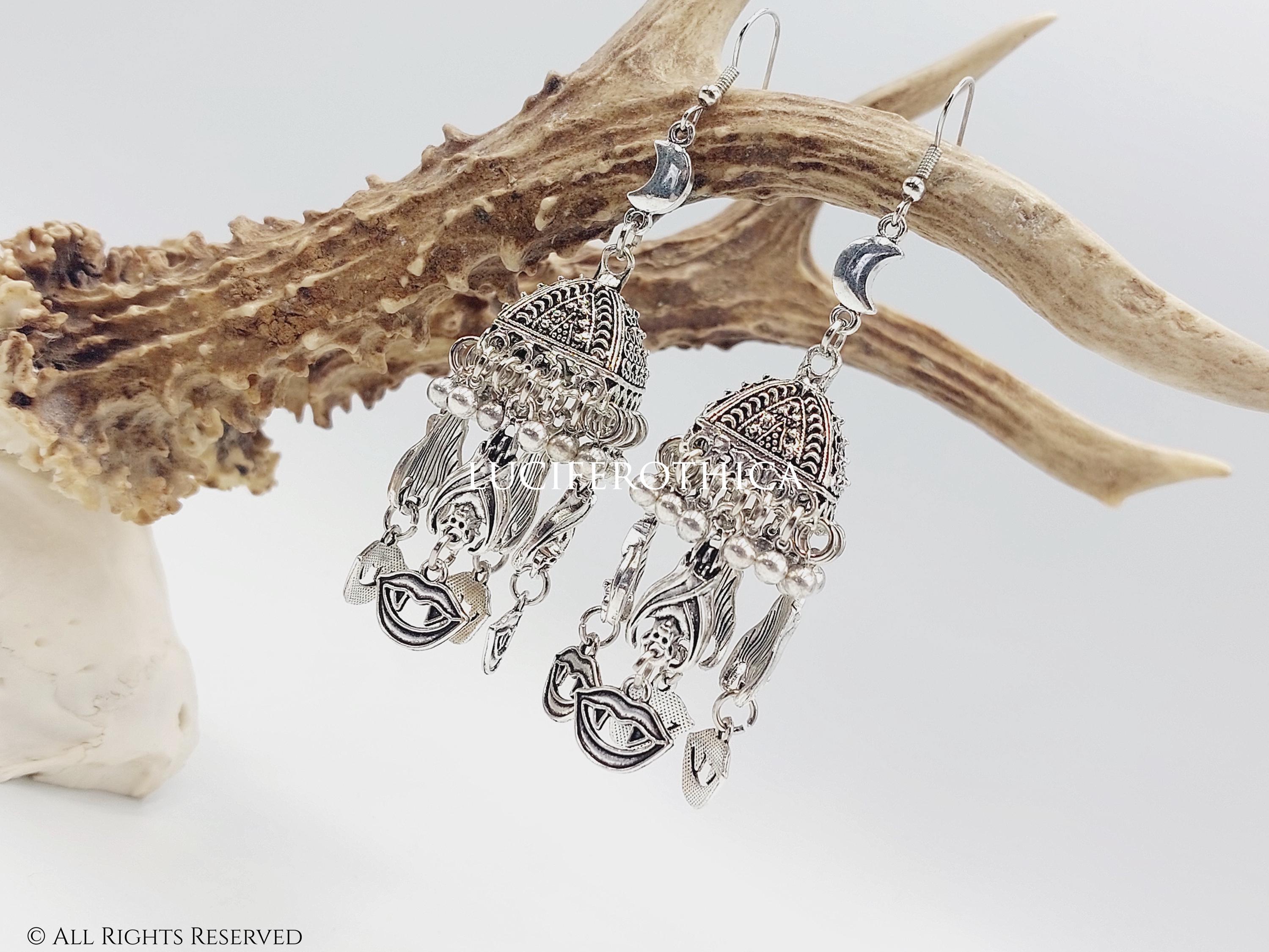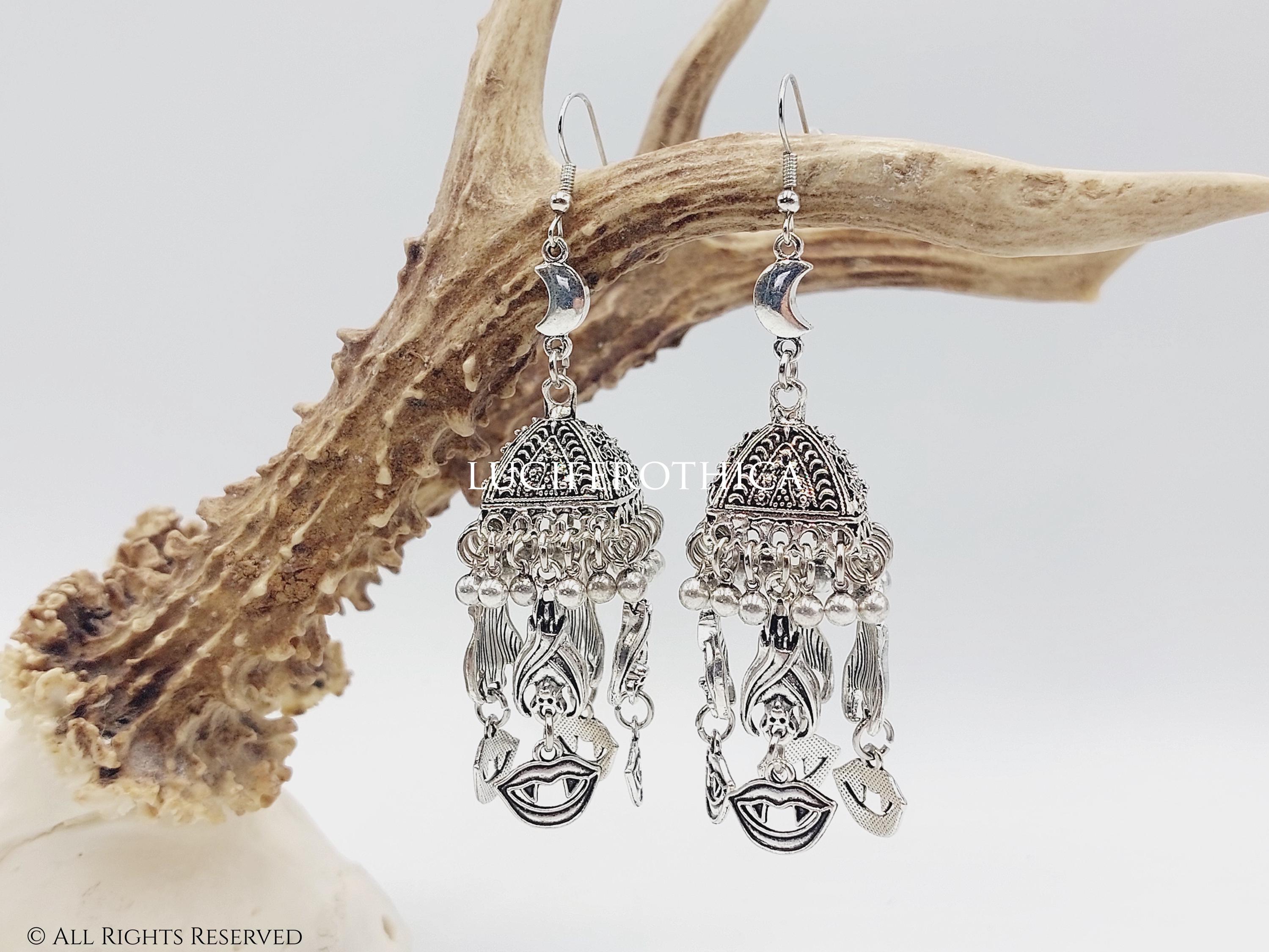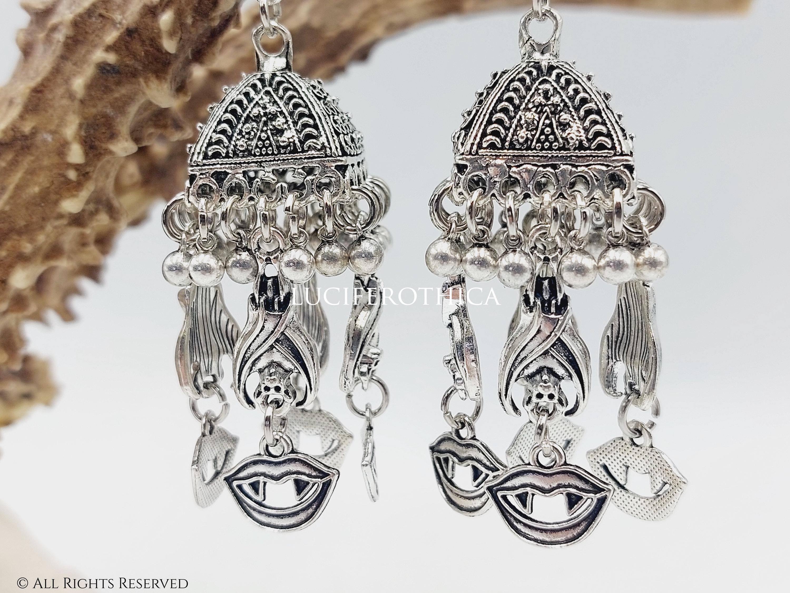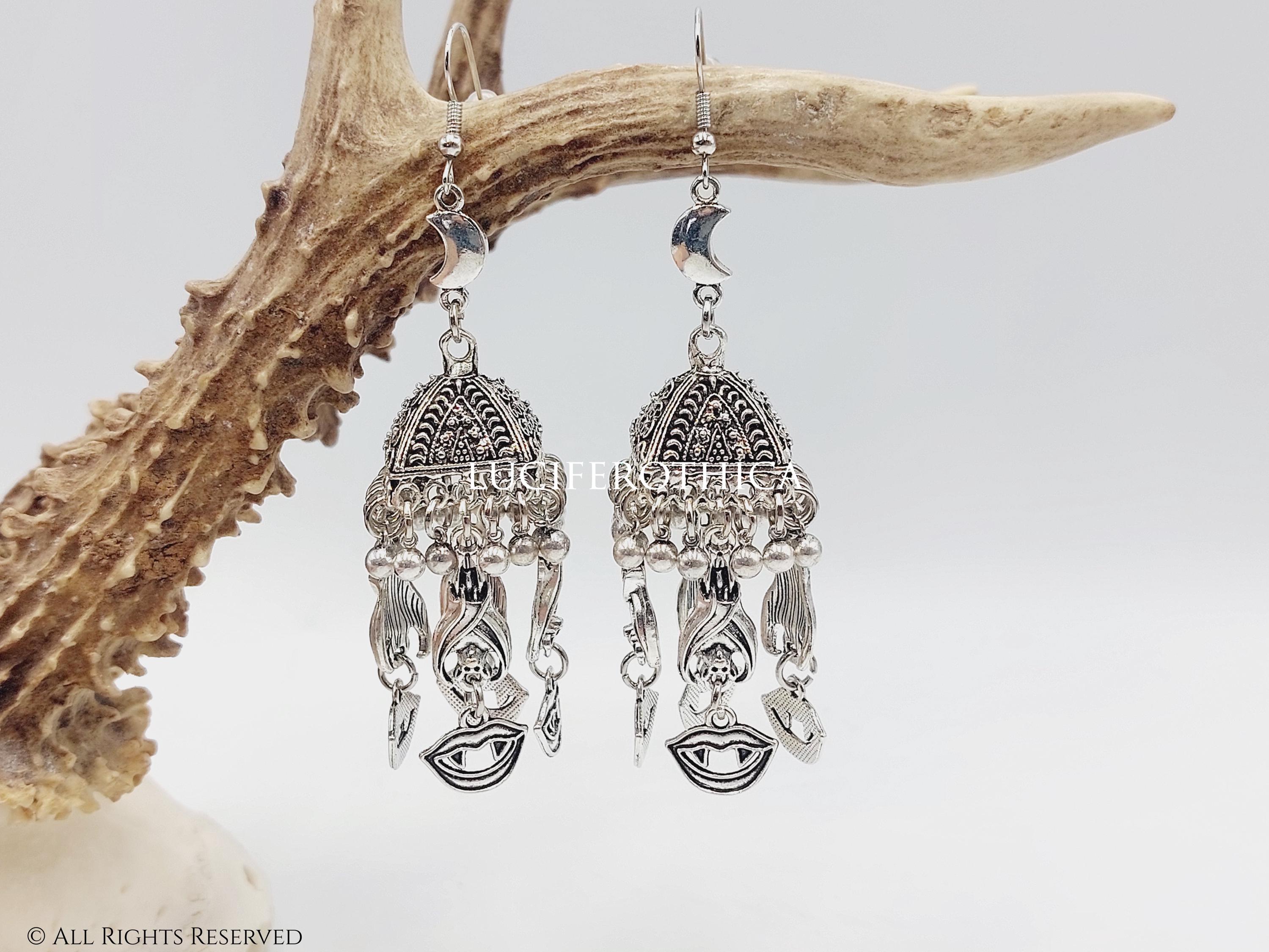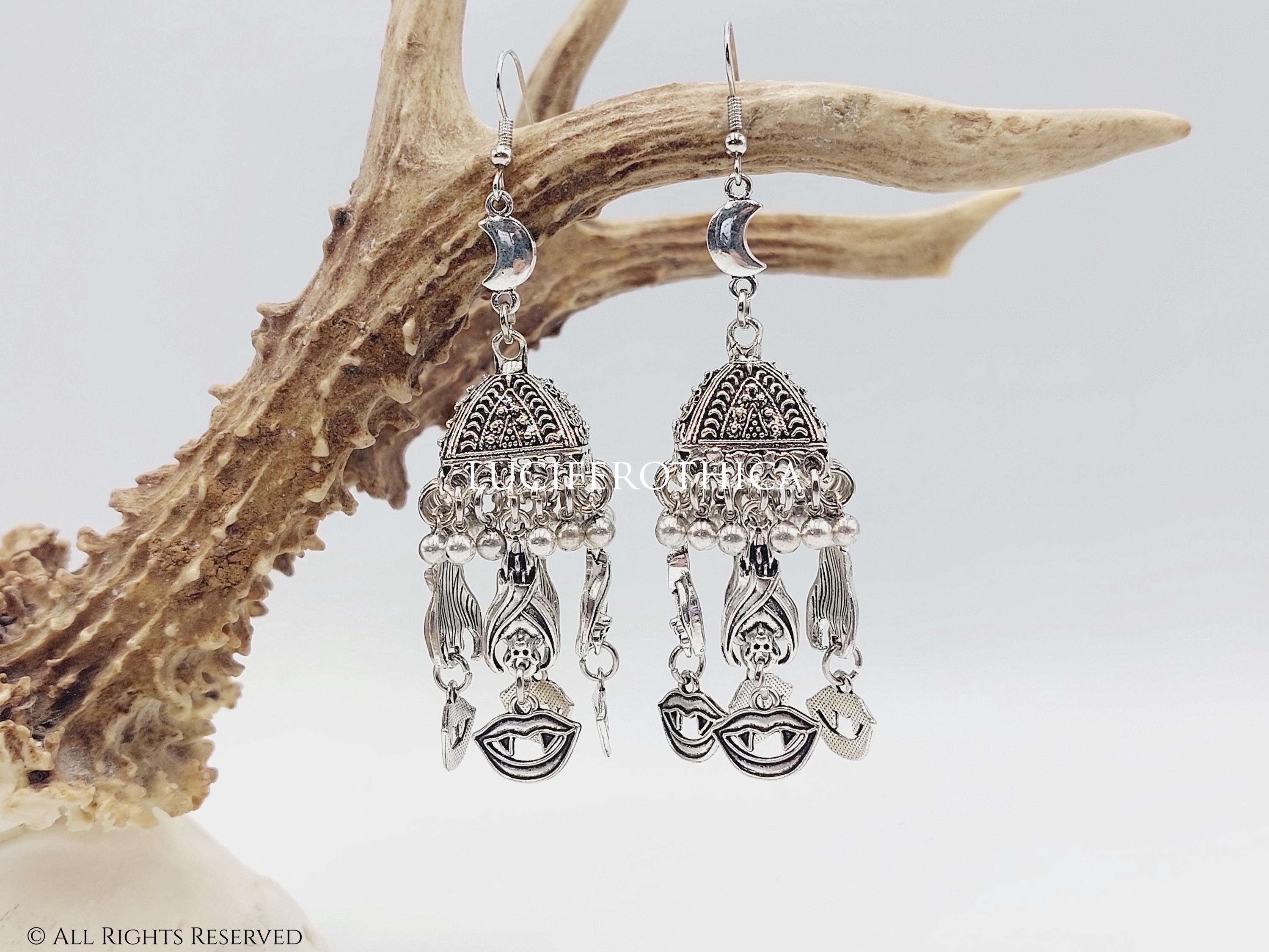 Gorgeous handmade pagoda dome shape umbrella chandelier earrings with hanging sleeping bats and vampire kiss charms