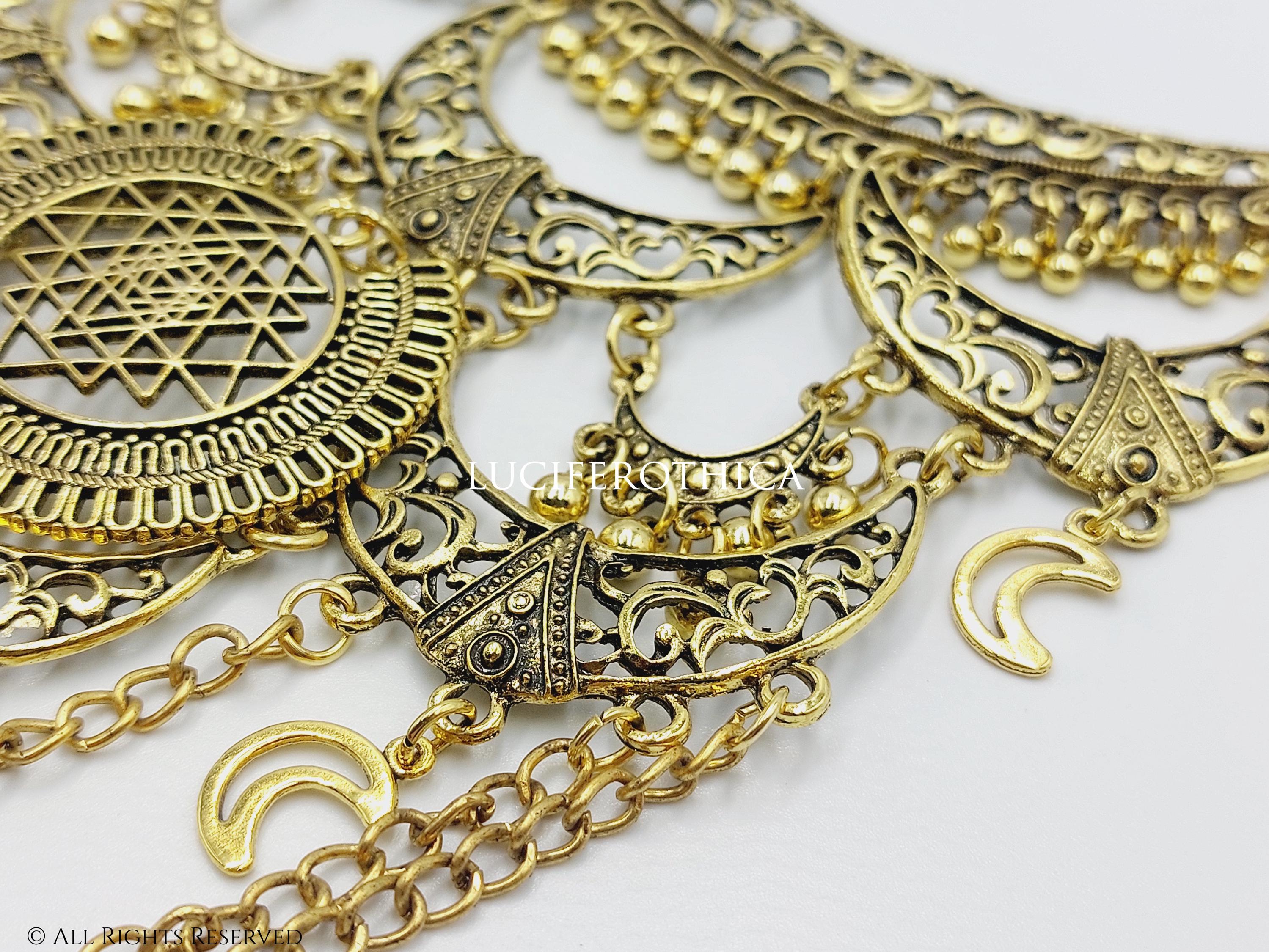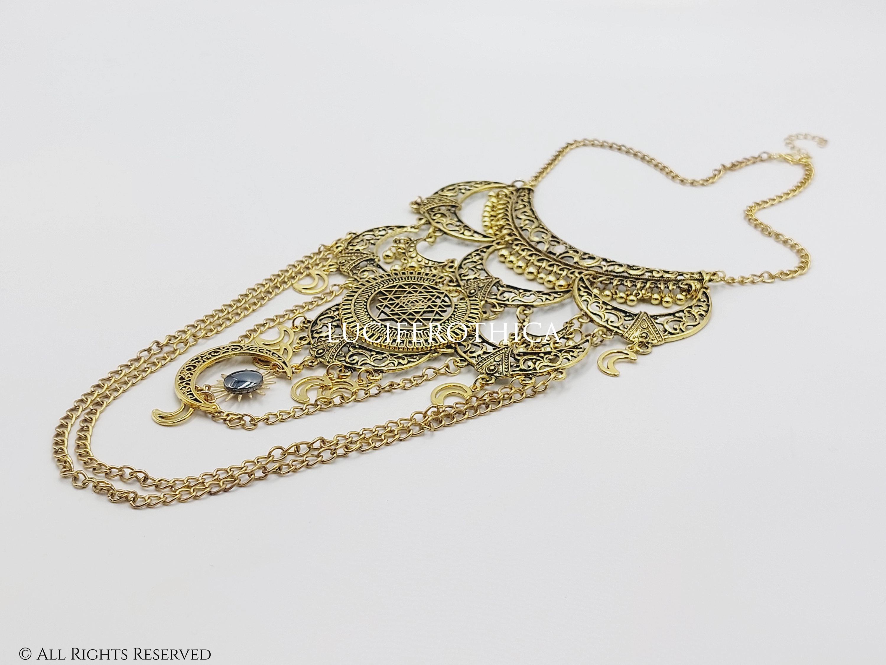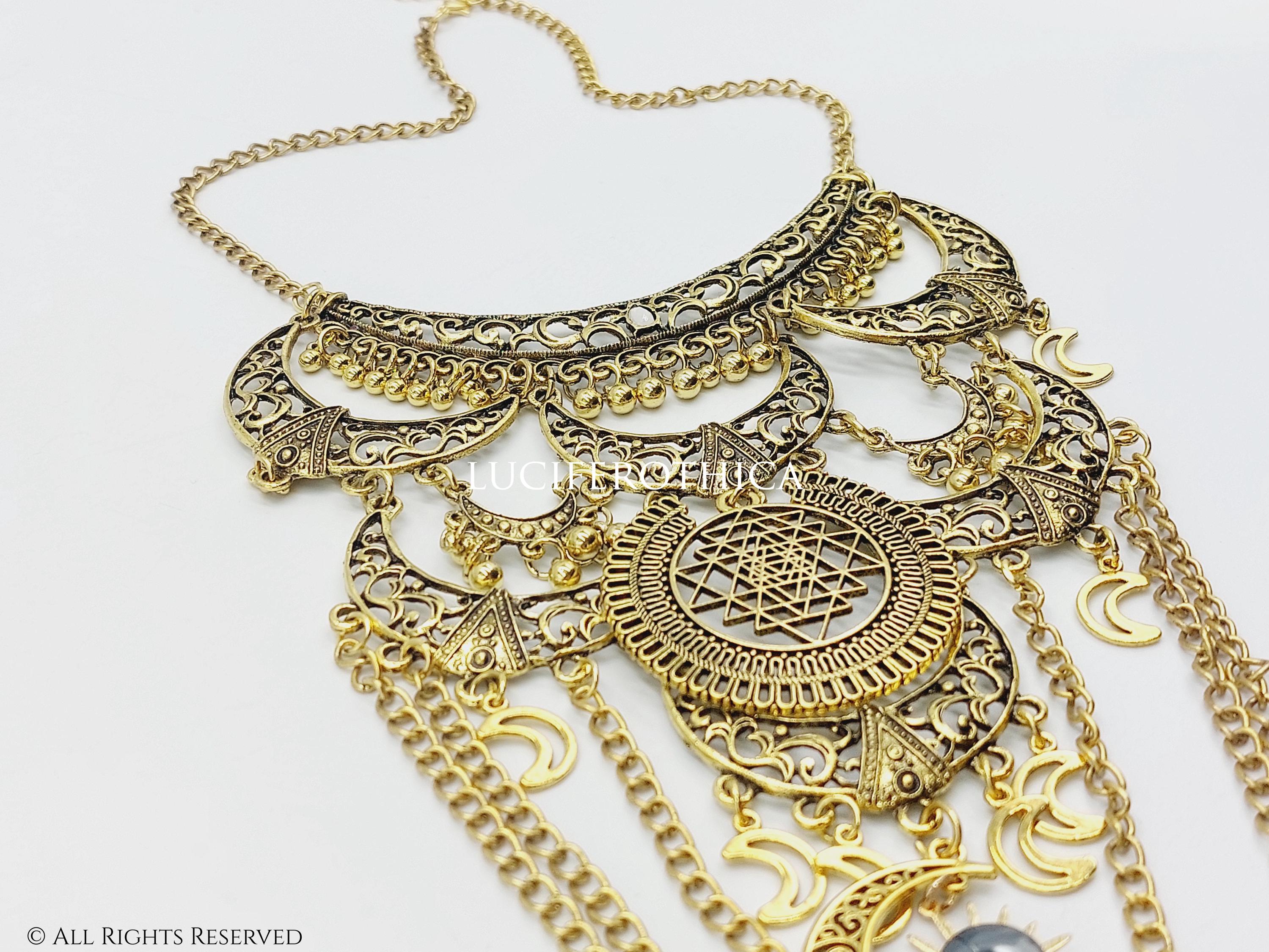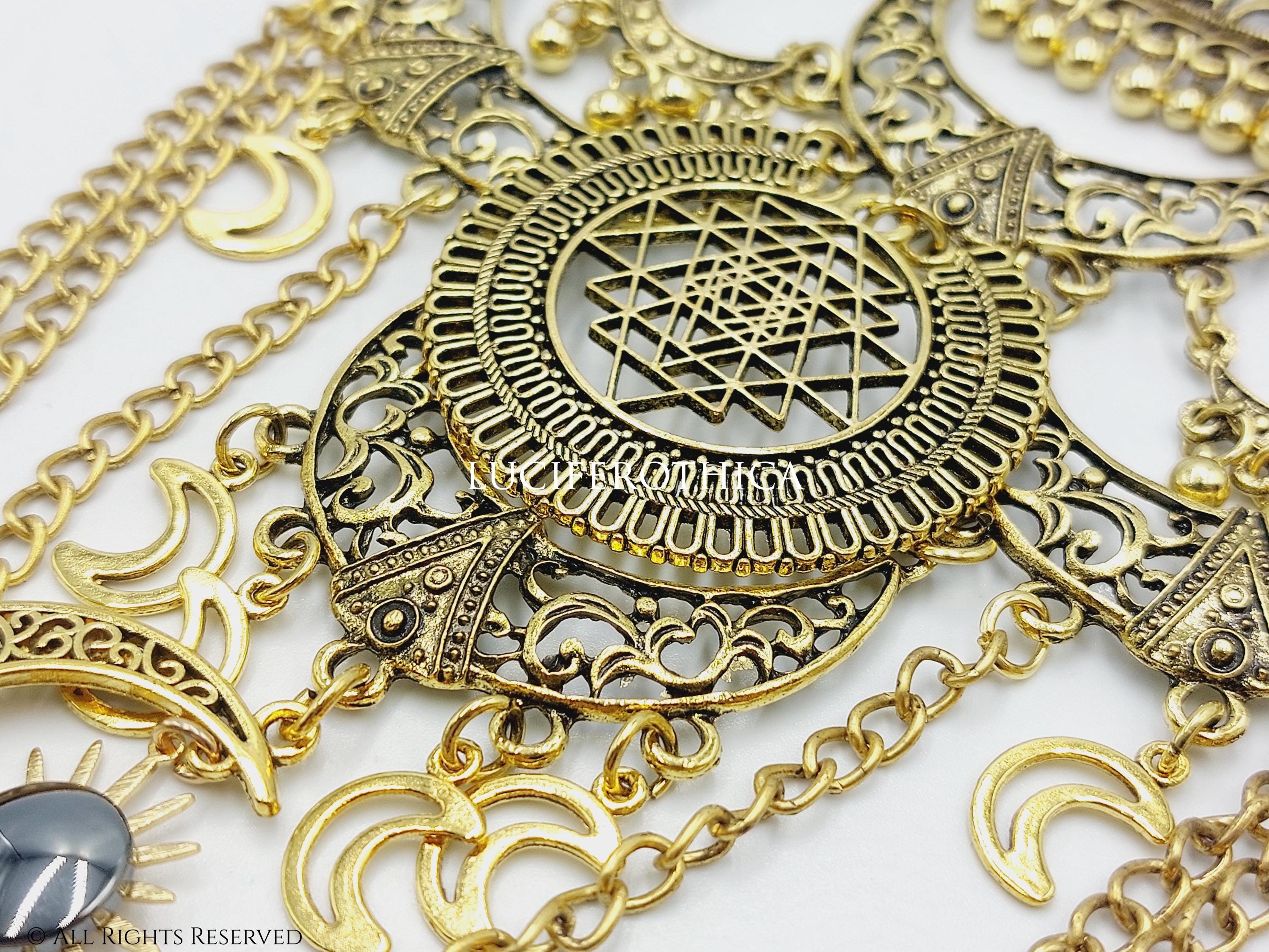 - Sun charm and larger crescent moon charm below the Yantra symbol.