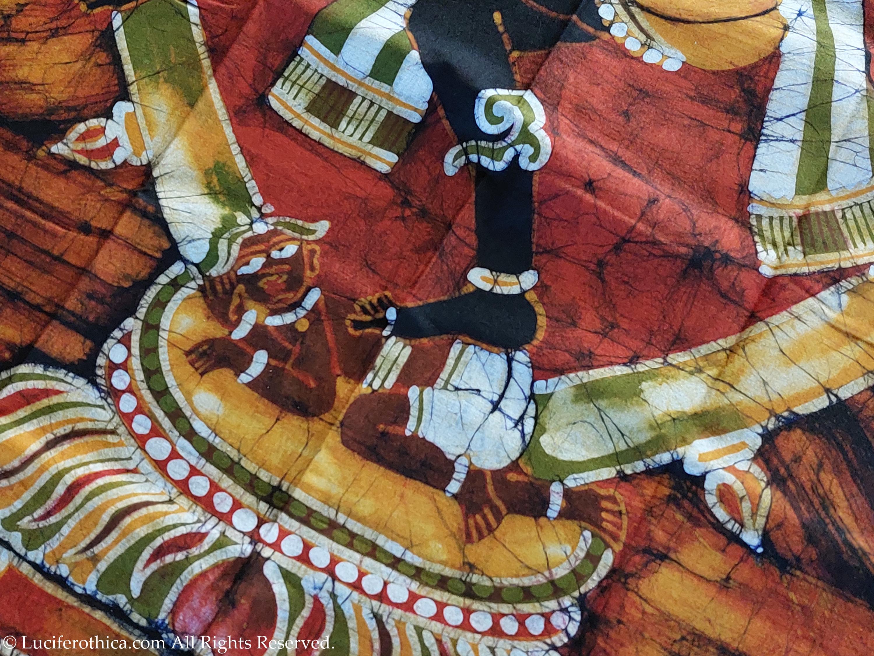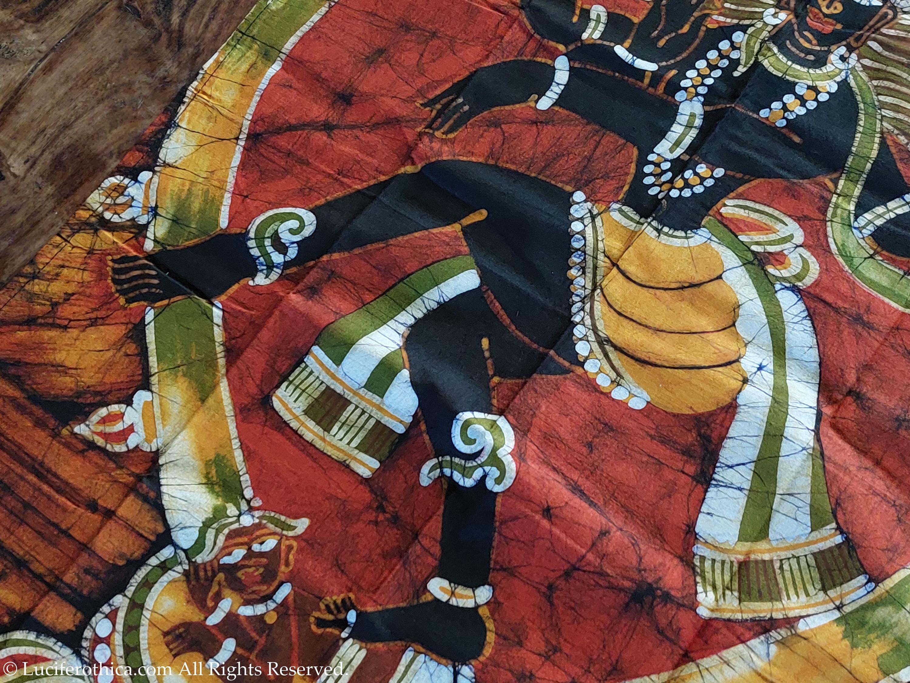 - Marvelous depiction of kali in natural color pigments on a red background.