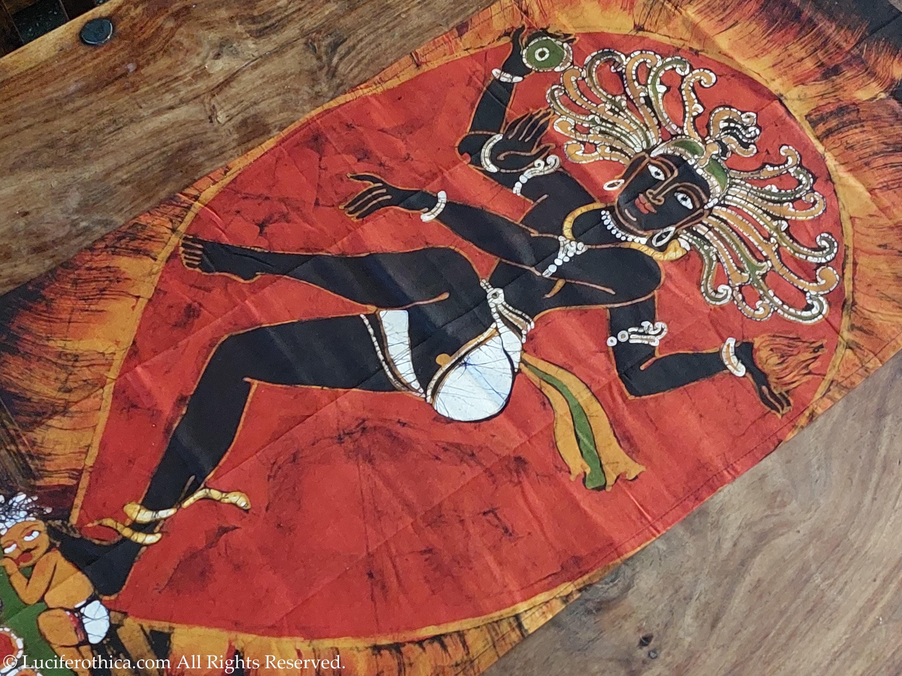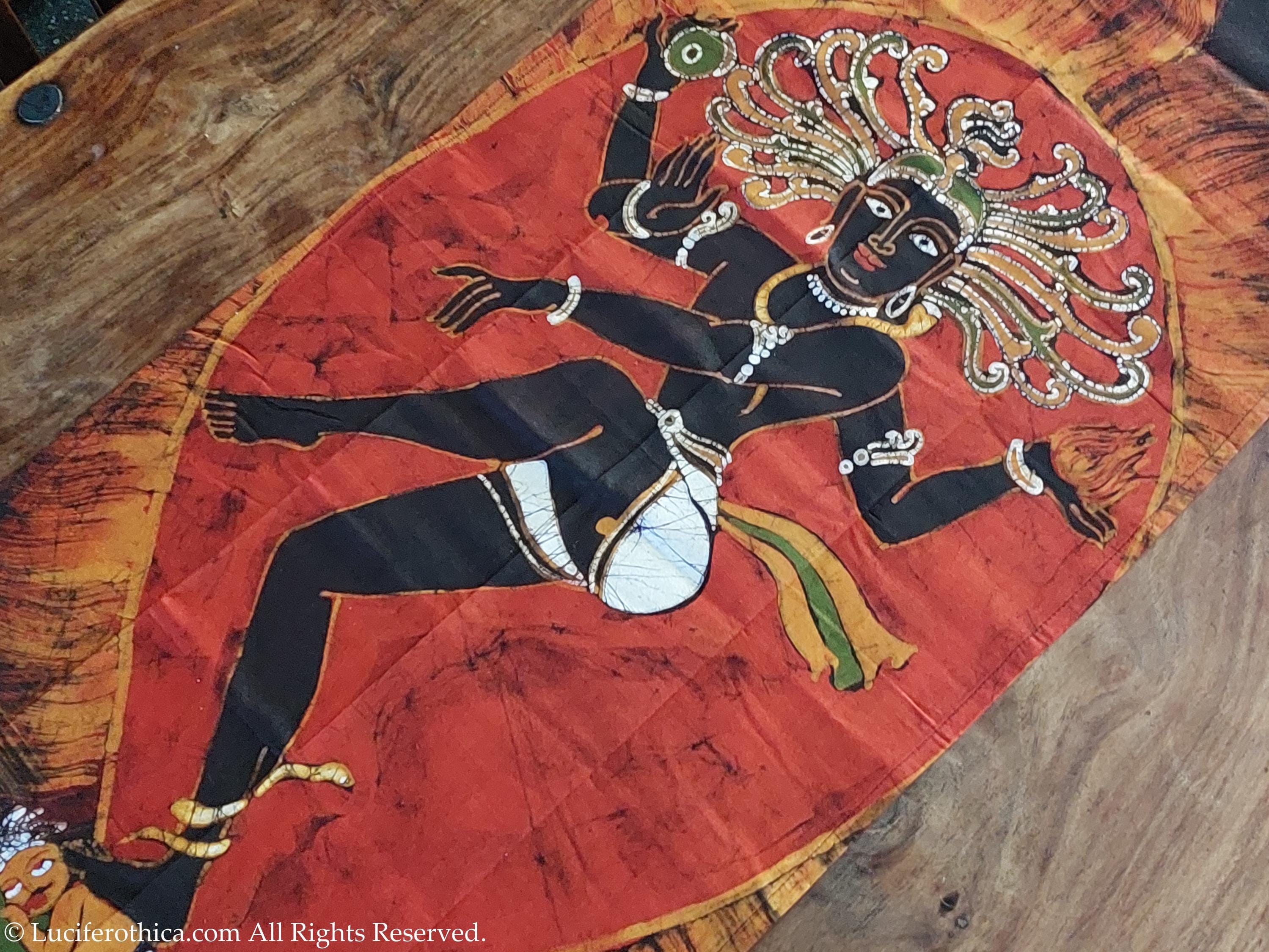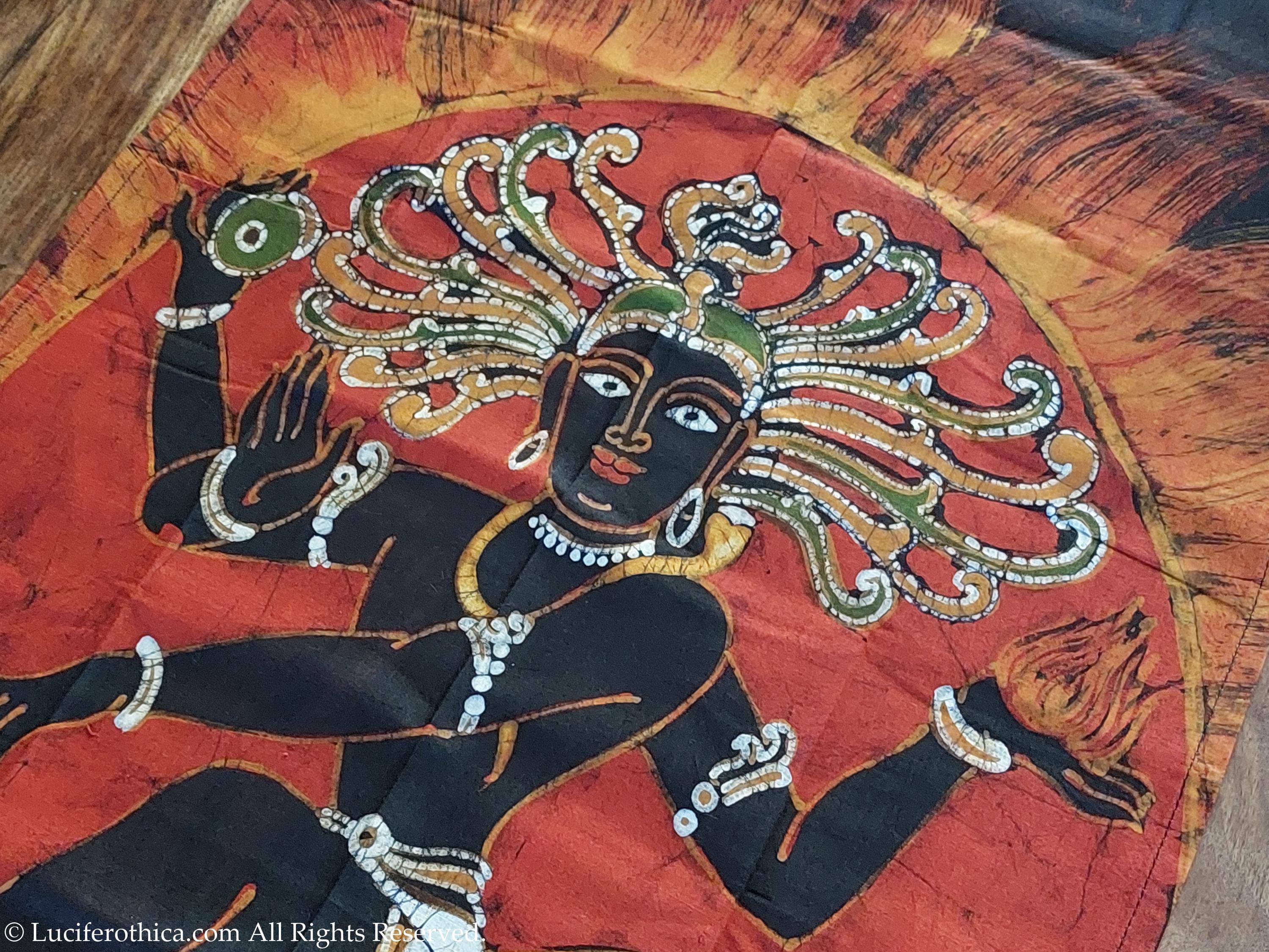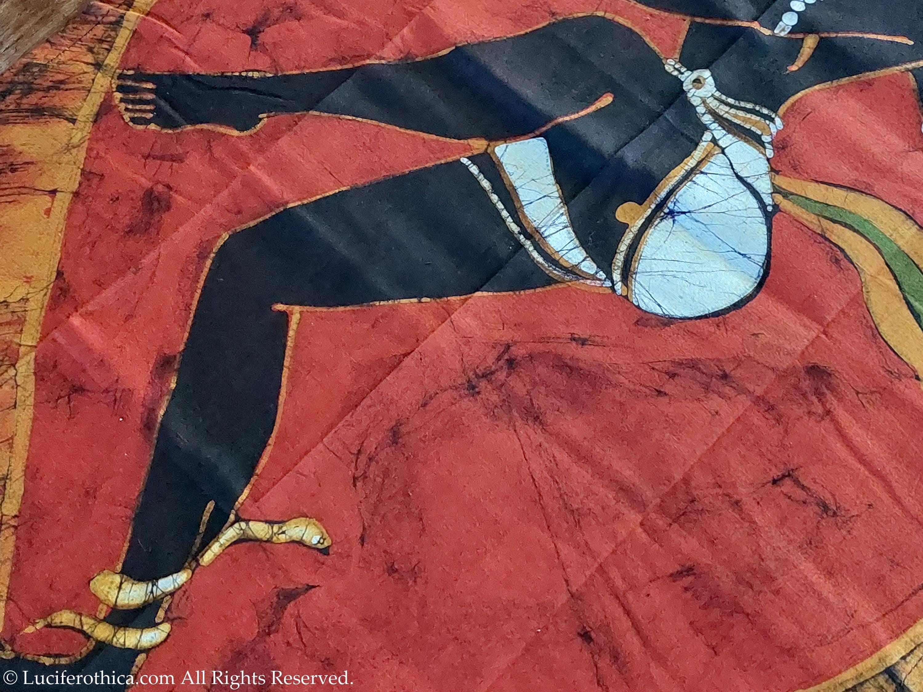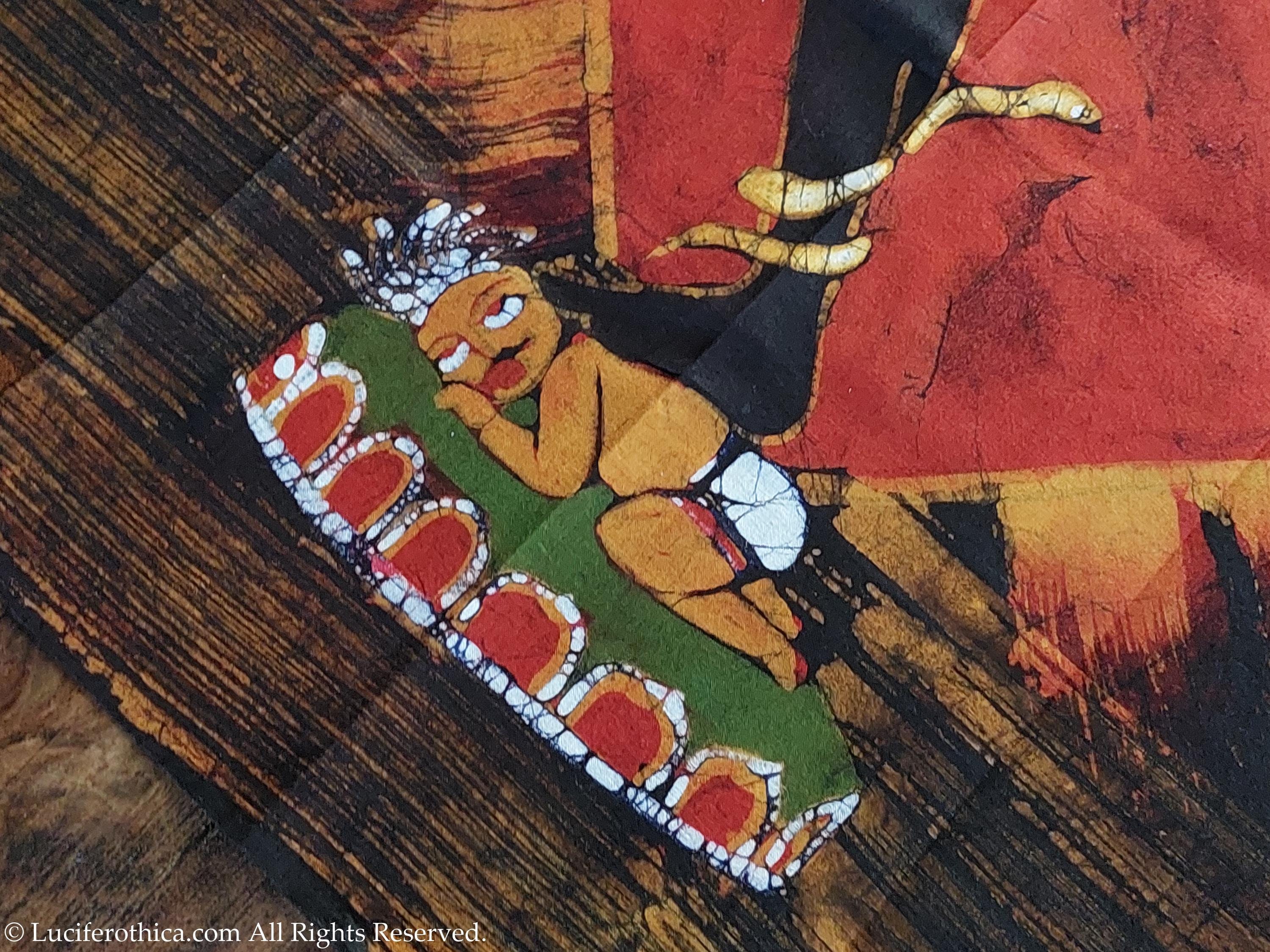 - Marvelous depiction of kali in natural color pigments on a red background.