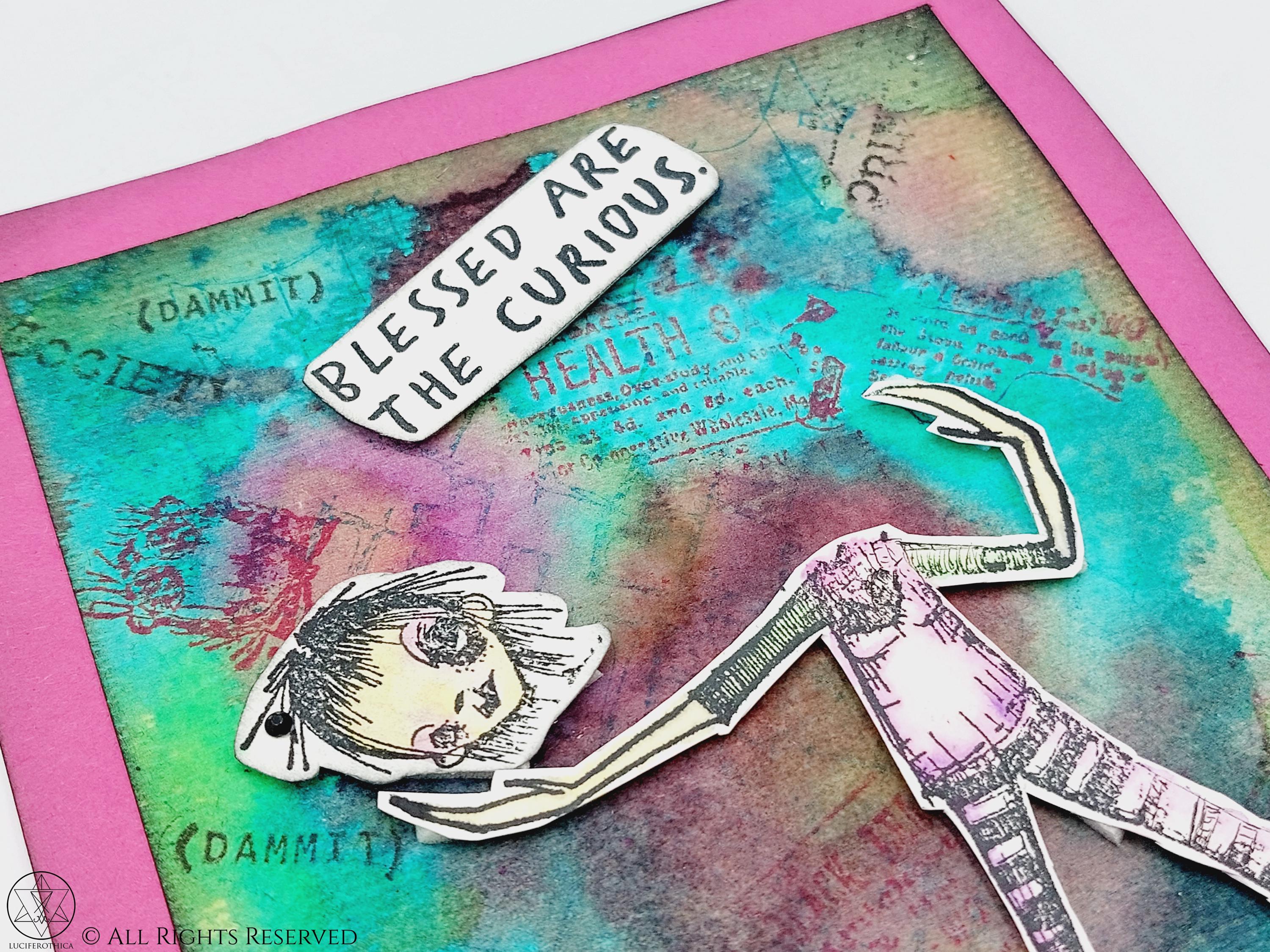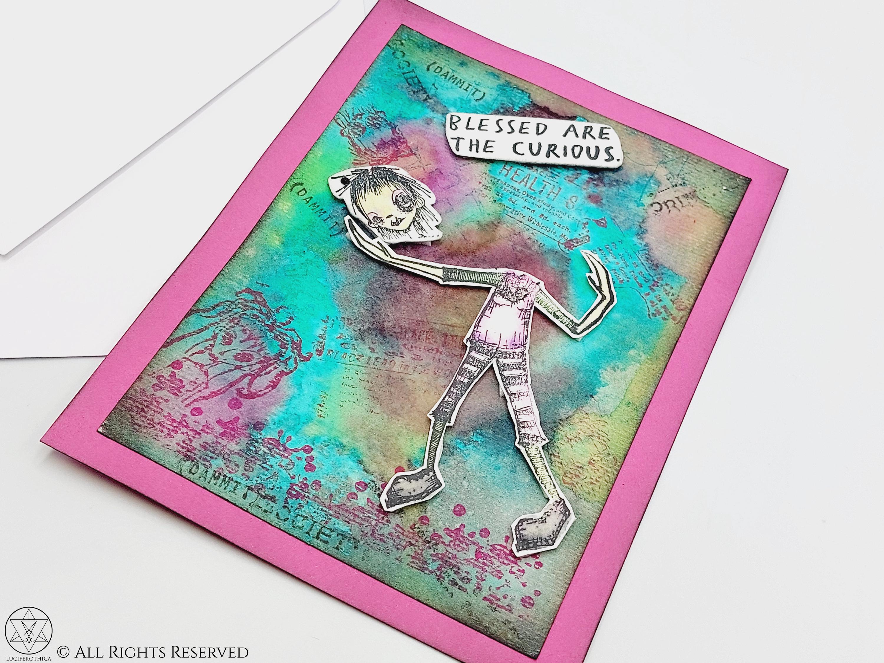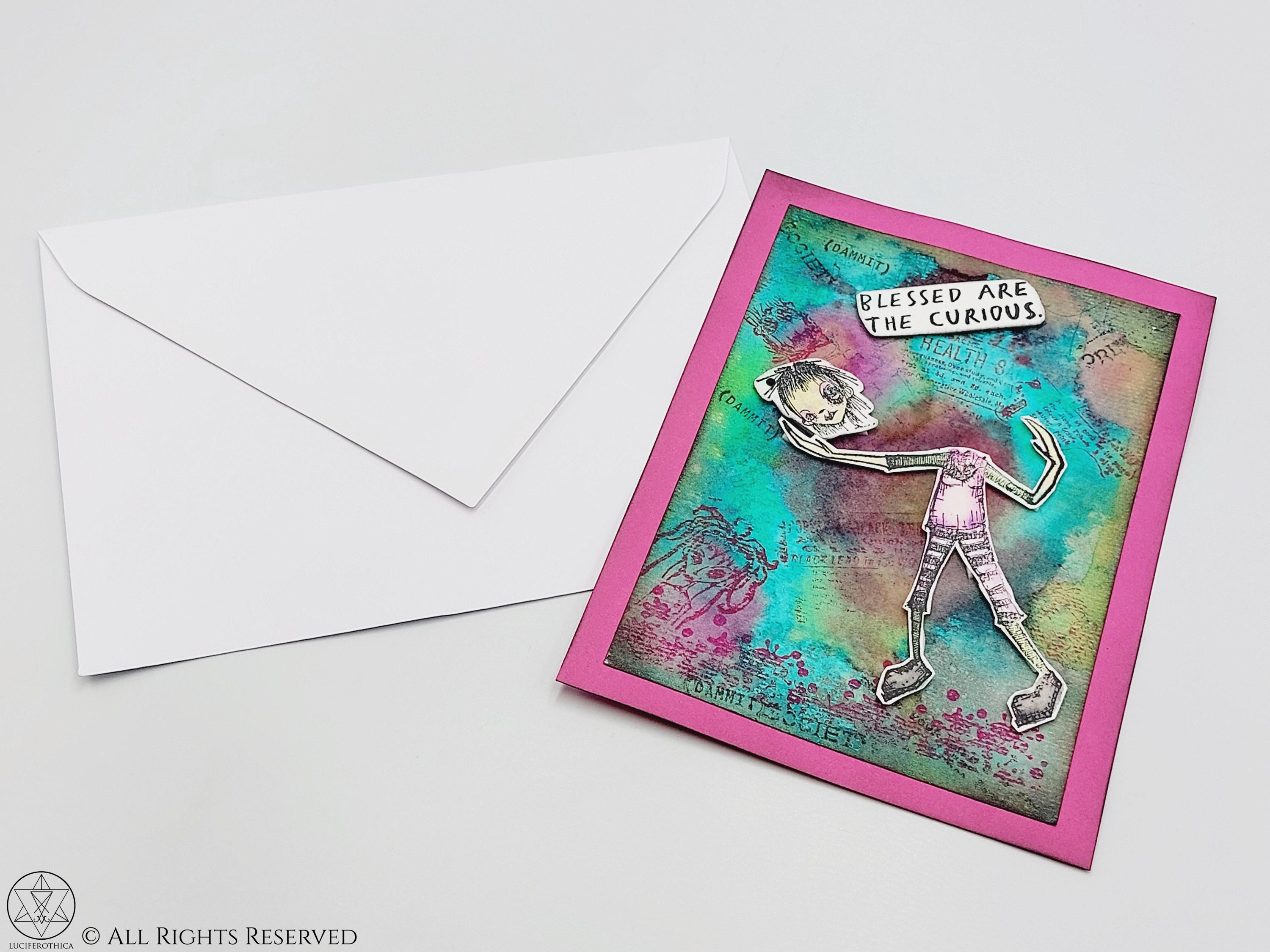 - Layered dimensional card with text: "Blessed Are The Curious"