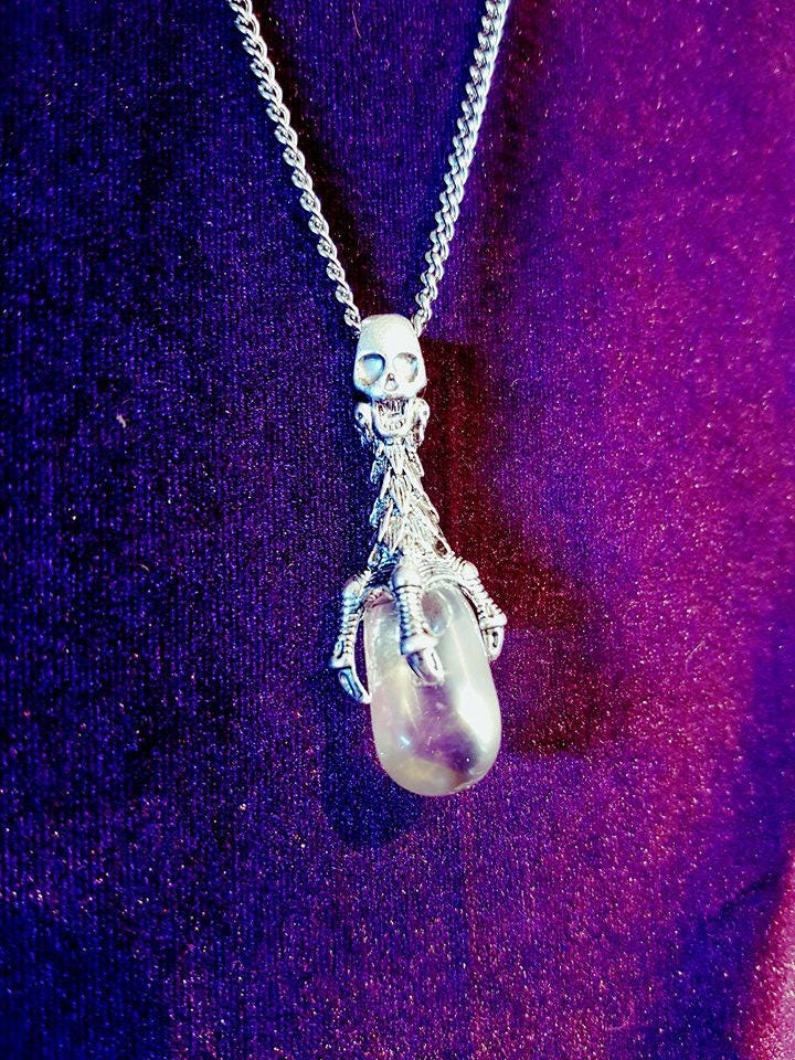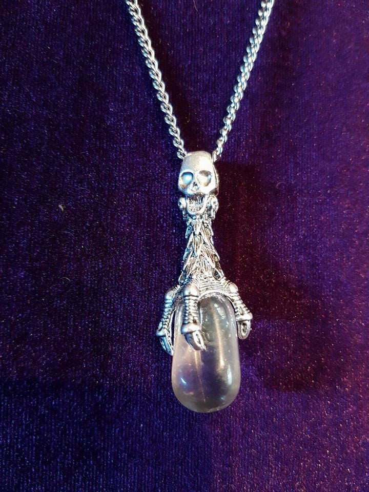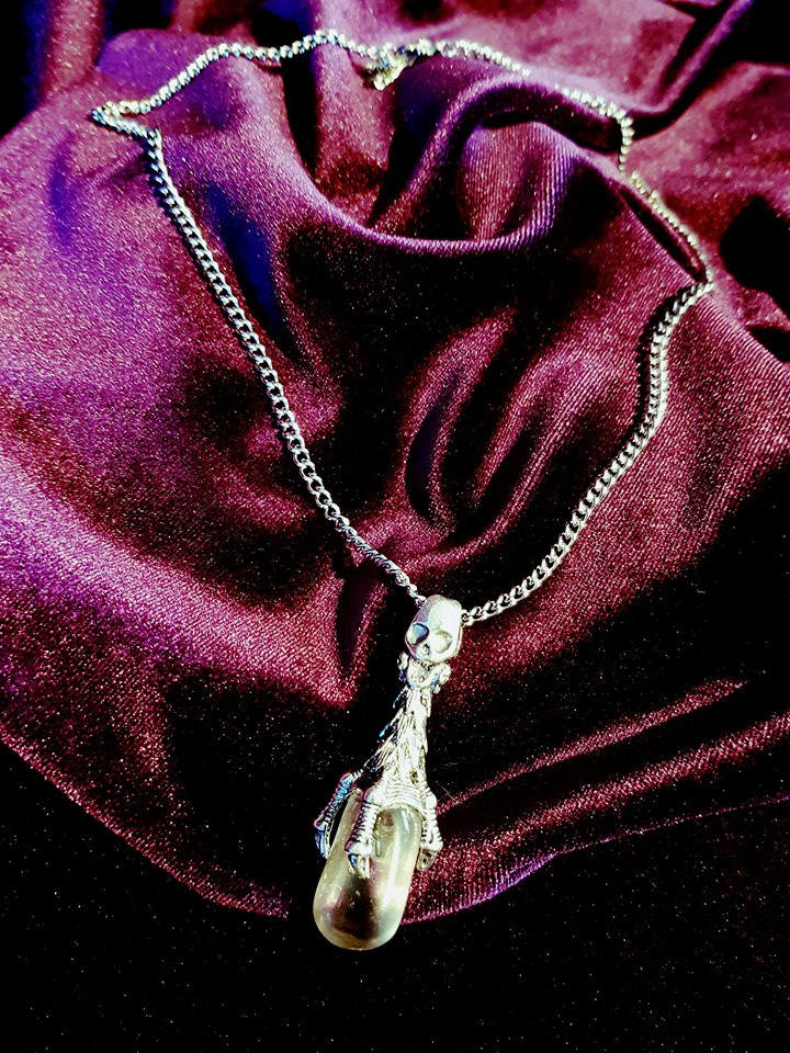 Beautiful stainless steel necklace with skull pendant and crystal quartz stone
