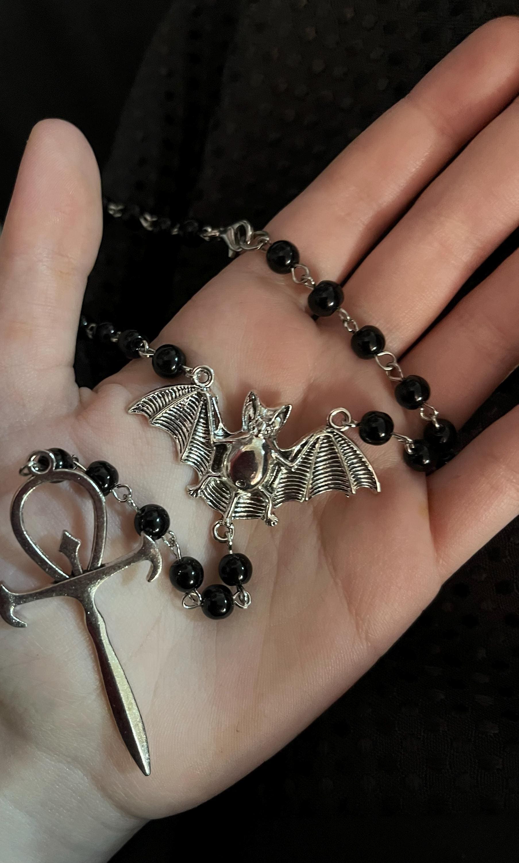 One of a kind vampiric rosary with 2 small ankhs coming together at a bat center piece.