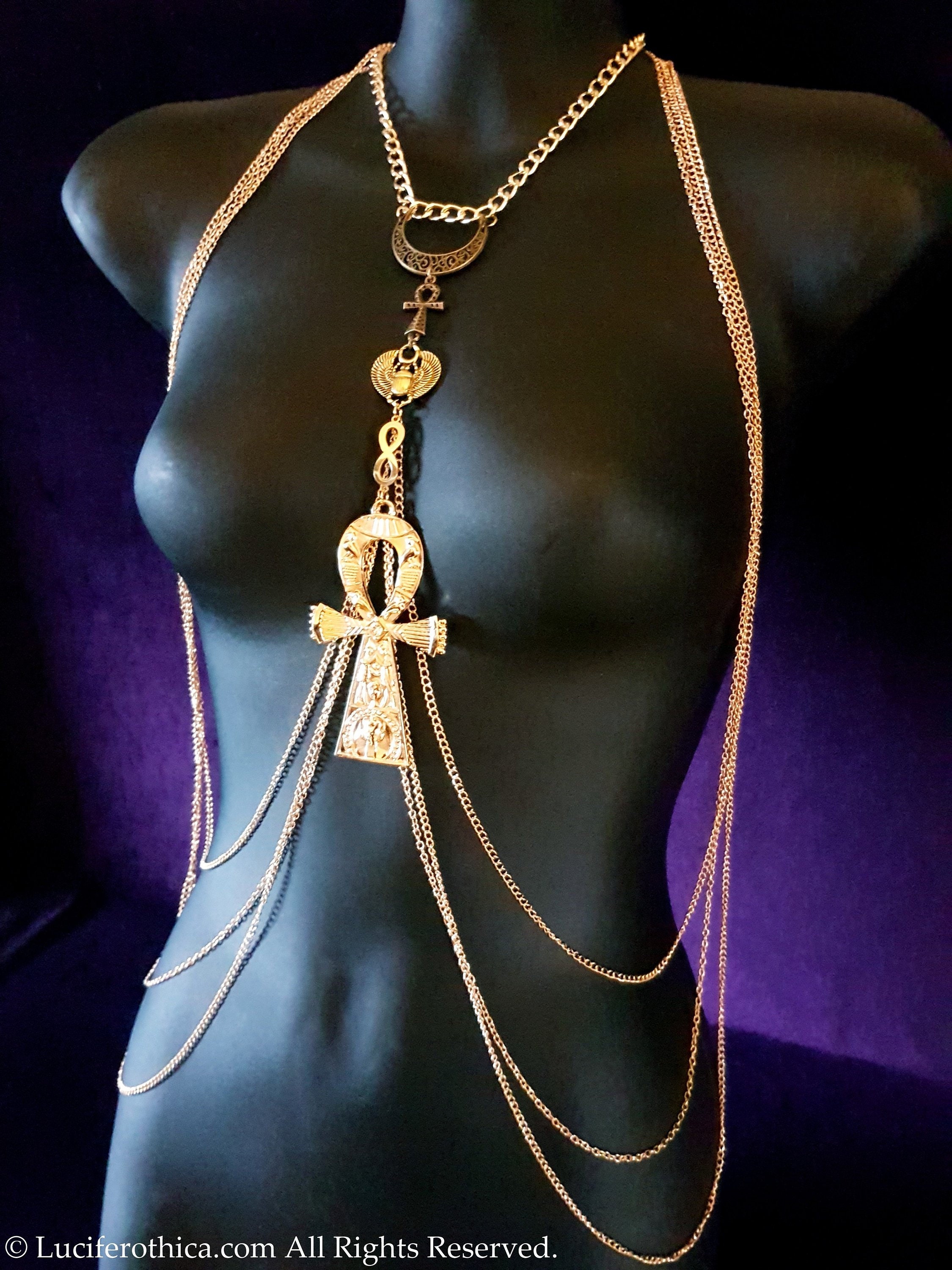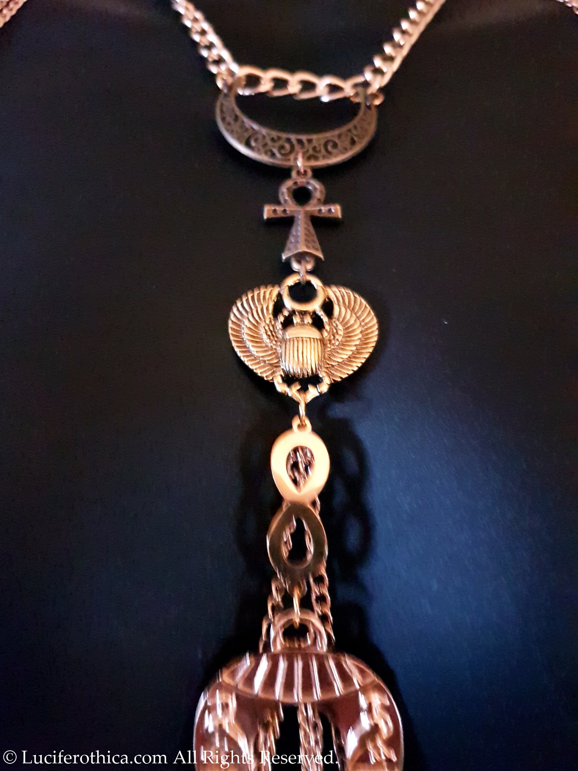 - Antique gold/bronze colour crescent moon and mini ankh symbol.