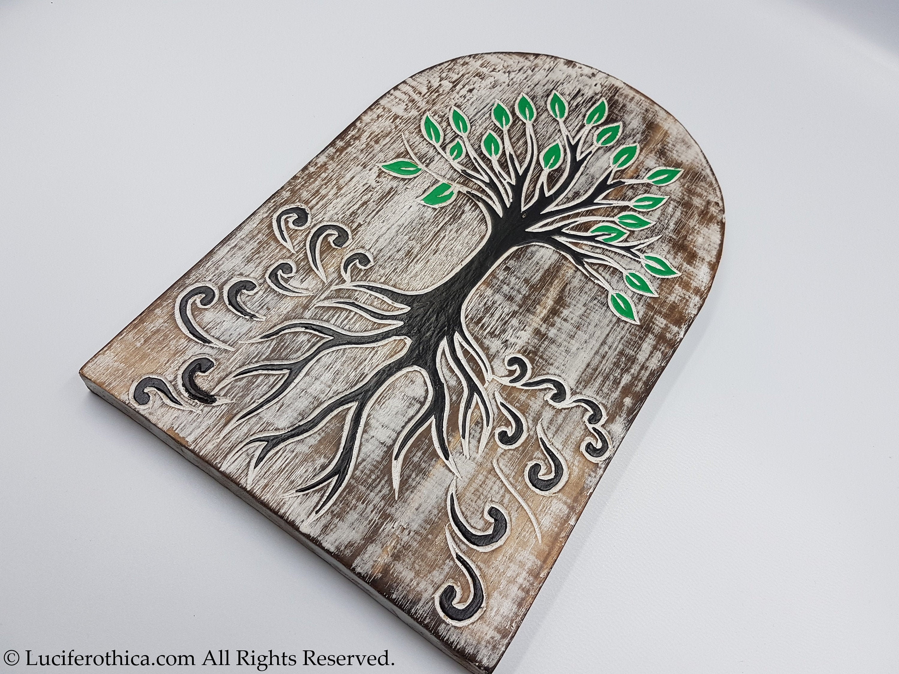 Handcrafted wooden wall plaque depicting the Tree of Life.