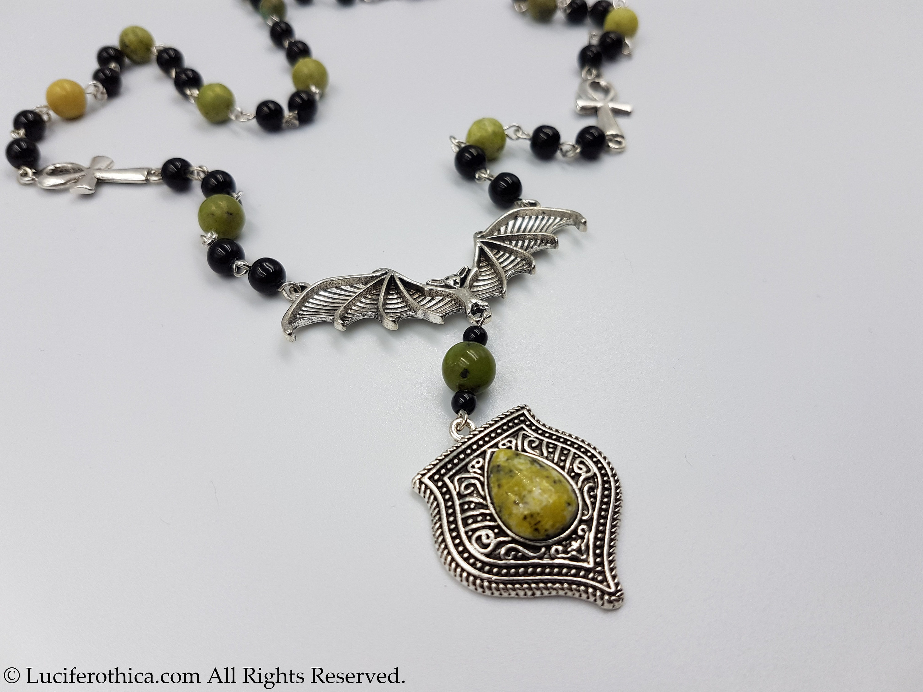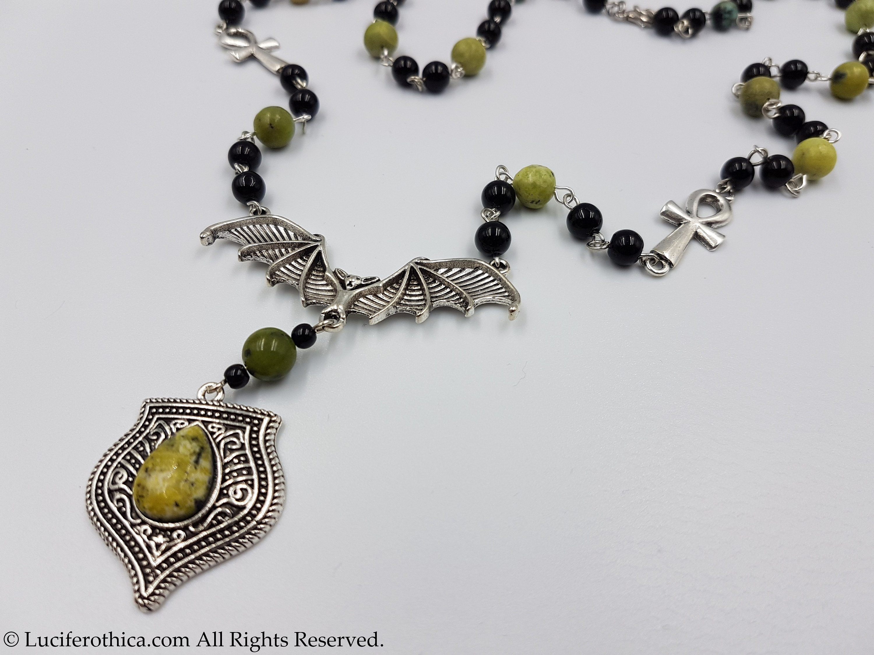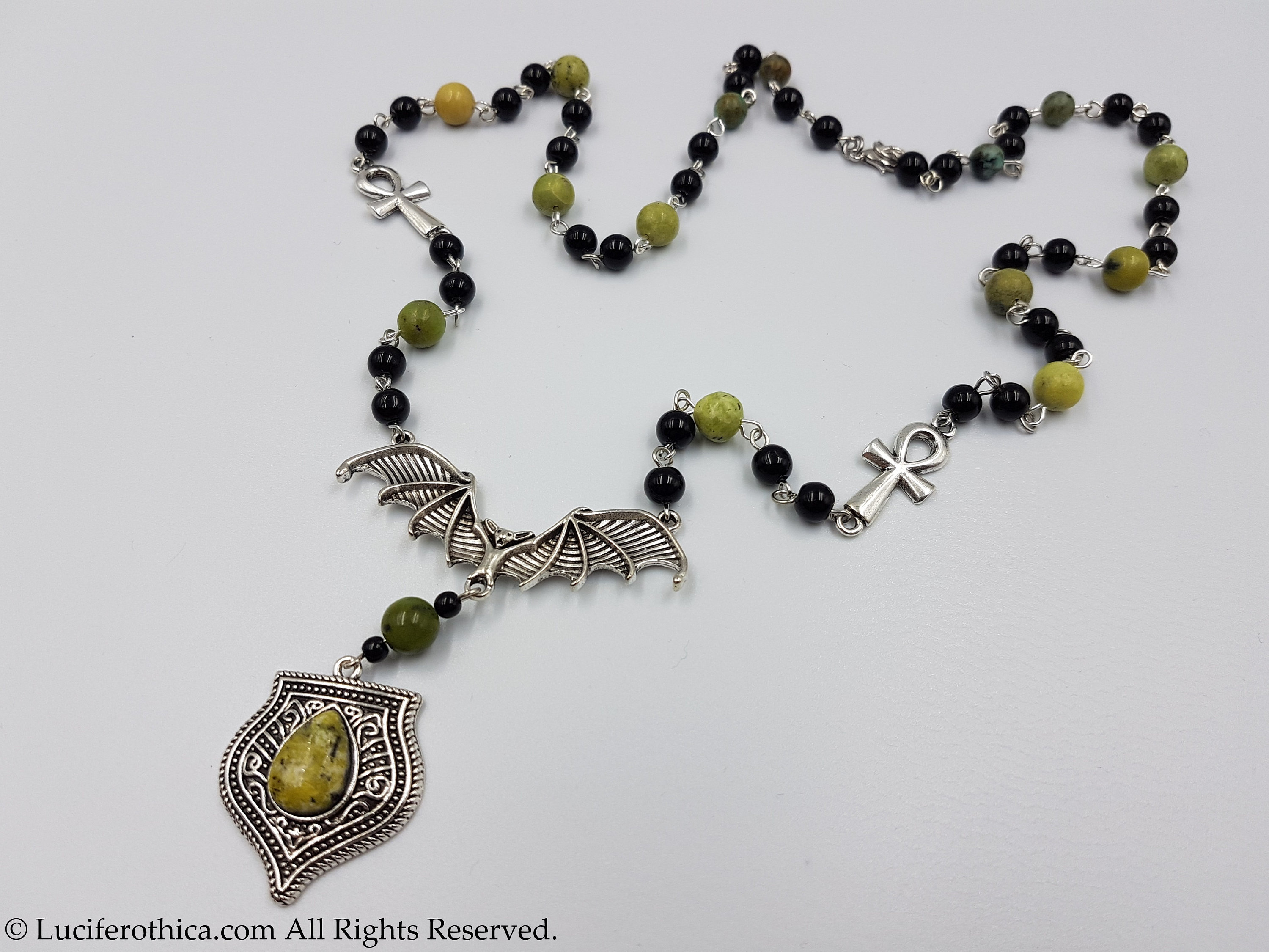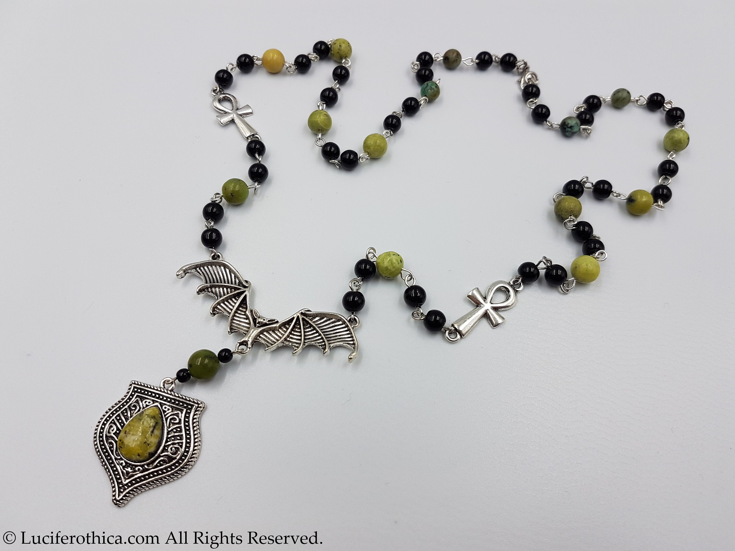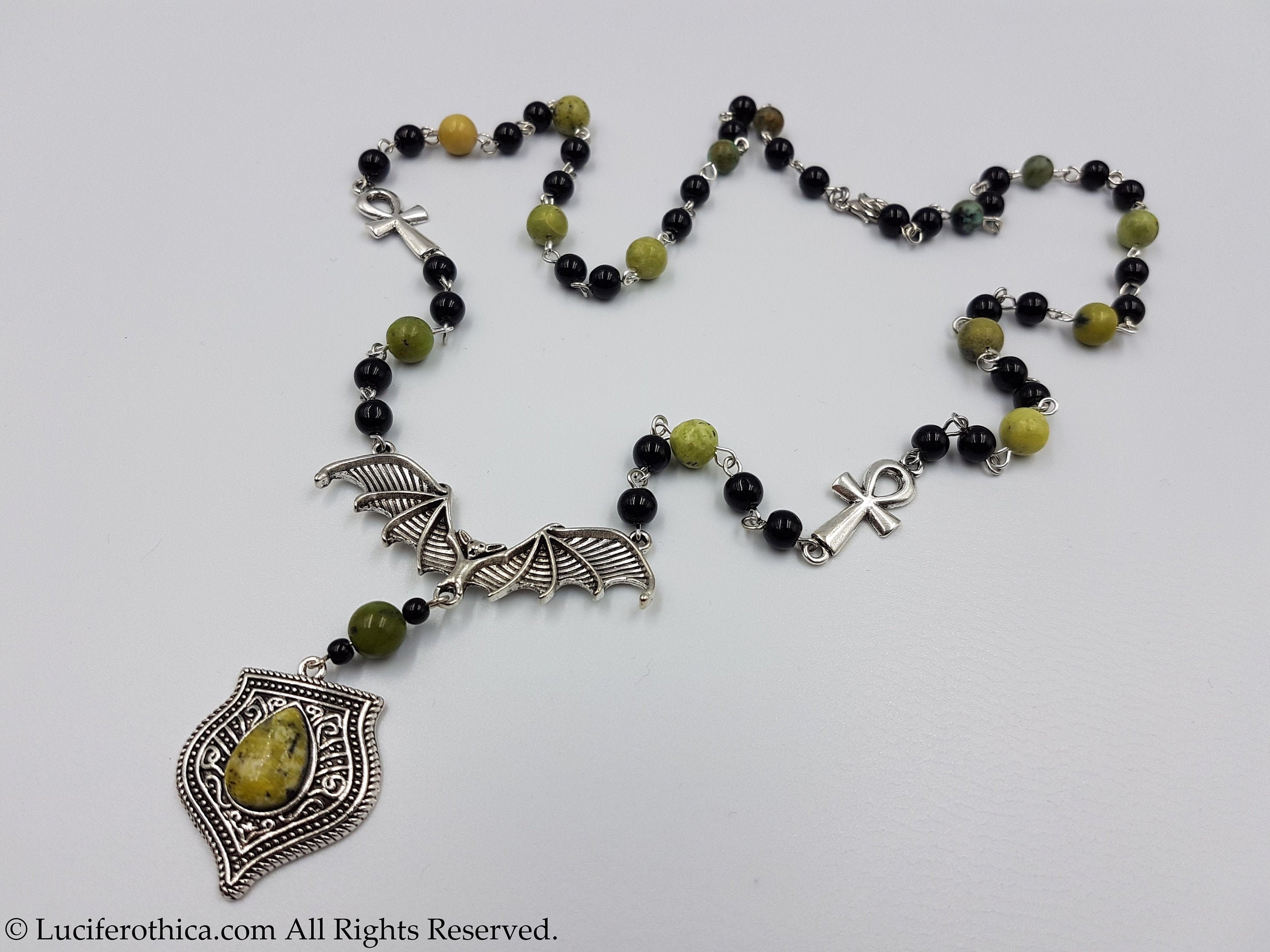 One of a kind vampiric rosary with 2 small ankhs coming together at a bat center piece.